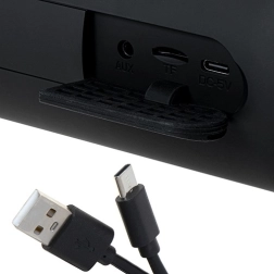 Bluetooth 5.0 so stabilným dosahom až 10 m, prehrávanie z SD karty a cez AUX. Podsvietené tlačidlá a USB‑C pre rýchle nabíjanie.