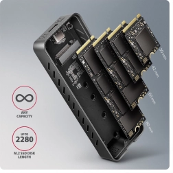 Vytvorte si bleskurýchly a kompaktný externý disk. Externý box AXAGON armored box s rozhraním USB 3.2 Gen 2x2 (20 Gb/s) je určený pre M.2 NVMe SSD (M‑key / B+M‑key) bez obmedzenia kapacity. Hliníkové šasi, teplovodivá podložka a bočné vetracie otvory zabezpečujú účinné chladenie a minimalizujú riziko thermal throttlingu. Silikónový ochranný návlek zlepšuje úchop, tlmí nárazy a bráni kĺzaniu po povrchu.