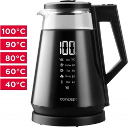 Kanvica umožňuje reguláciu teploty v štyroch krokoch (40°C, 60°C, 80°C, 100°C). Vďaka čitateľnému digitálnemu displeju budete mať dokonalý prehľad o nastavenom programe a aktuálnej teplote vody. Funkcia KEEP WARM udržiava nastavenú teplotu až po dobu 4 hodín.