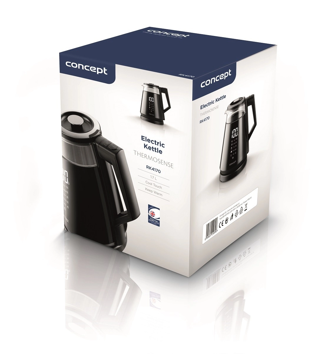 ThermoSense RK4170 je moderná sklenená rýchlovarná kanvica, ktorá sa vyznačuje elegantným dizajnom a čitateľným digitálnym displejom. Ponúka kapacitu 1,7 litra, možnosť regulácie teploty v štyroch krokoch (40°C, 60°C, 80°C, 100°C) a funkciu udržiavania teploty (KEEP WARM) po dobu až 4 hodín.
