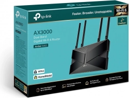 Výkon routera je podporený Wi-Fi štandardom 802.11ax a kombinovanou rýchlosťou prenosu dát až 3000 Mbps, rozdelenou do pásiem 5 GHz a 2,4 GHz pre maximálnu efektivitu a rýchlosť.