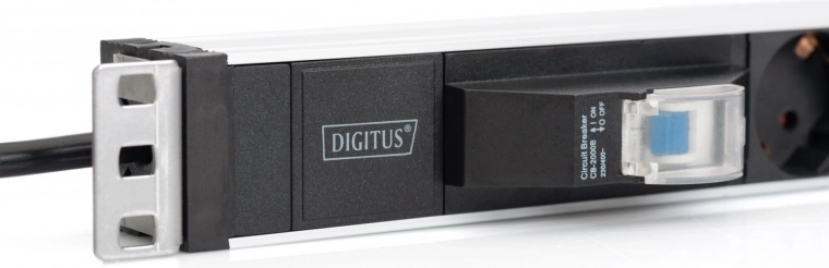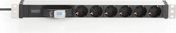 19'' PDU lišta DIGITUS so 6 zásuvkami Schuko, 2 m káblom a ističom 16 A. Hliníkové šasi, montáž 1U horizontálne aj vertikálne, zásuvky 45° bez blokovania.