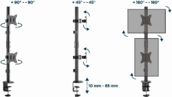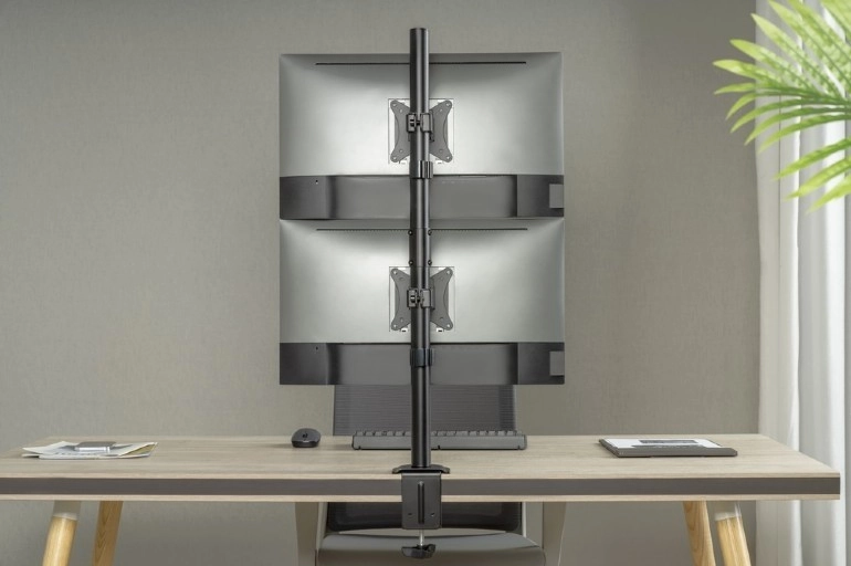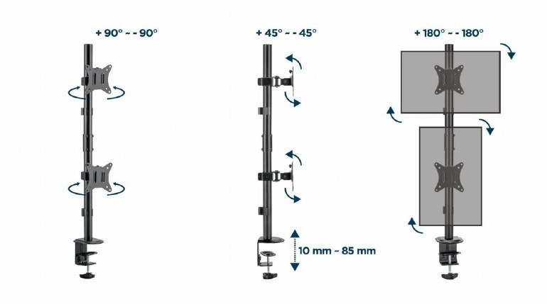 Tento kovový stojan pre dva monitory umožňuje usporiadať displeje nad sebou a vytvoriť tak kompaktné, ergonomické a produktívne pracovisko. Vďaka flexibilným kĺbom ľahko nastavíte náklon, otáčanie aj orientáciu z na šírku na výšku a naopak.