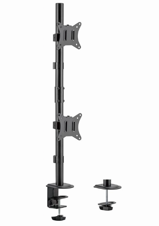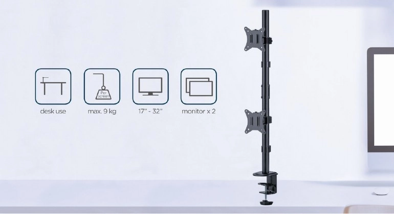 Ušetrite miesto na stole a zvýšte ergonómiu s týmto robustným vertikálnym držiakom pre dva monitory 17–32". Ponúka otočenie, náklon a nastavenie výšky, kompatibilitu VESA 75x75 a 100x100, pevné uchytenie pomocou svorky alebo priechodky a integrované vedenie káblov pre čisté a prehľadné pracovisko.