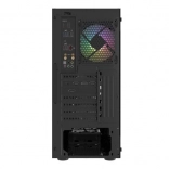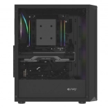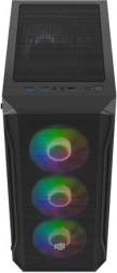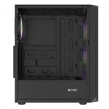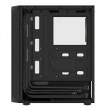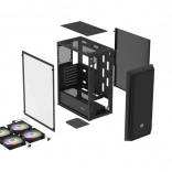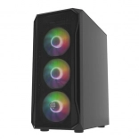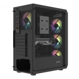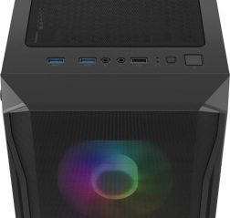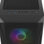 Horný I/O panel je pripravený na všetko podstatné: 2× USB 3.0, 1× USB 2.0, HD Audio 3,5 mm pre slúchadlá a mikrofón, tlačidlá Power/Reset a indikačné diódy. Tvrdené sklo na ľavej bočnici zvýrazní vaše komponenty aj RGB efekty, zatiaľ čo husté prachové filtre udržia vnútro dlhodobo čisté.