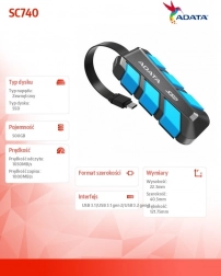ADATA SC740 je prenosné SSD navrhnuté pre rýchlosť, odolnosť a pohodlie. Vďaka rozhraniu USB 3.2 Gen 2 dosahuje sekvenčného čítania až 1050 MB/s a zápisu až 1000 MB/s, takže môžete pracovať s 4K videom, fotografiami aj rozsiahlymi projektmi priamo z disku bez zdržania. Integrovaný USB‑C kábel a praktický držiak kábla robia zo SC740 ideálneho spoločníka na cesty.