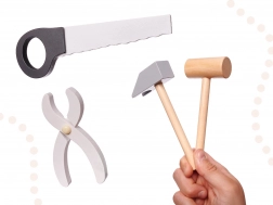 Táto veľká drevená súprava náradia splní sen každého malého kutila. Skrutkovače, kladivo, skrutky, kľúče - všetky prvky potrebné v profesionálnej dielni. Dieťa poteší možnosť neobmedzeného vŕtania, zatĺkania klincov a rezania. Vďaka drevenému boxu s rukoväťou je celá súprava mobilná, takže dieťa si bude môcť vziať náradie so sebou na akýkoľvek naliehavý problém.
