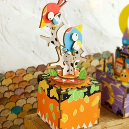 Vychutnajte si stavbu detailného farebného modelu dvojice vtáčikov na vetve, ktorý po dokončení oživí vašu poličku príjemným zvukom aj jemným pohybom. Kvalitné drevené diely s presnou potlačou do seba presne zapadajú a spolu s kovovými prvkami tvoria stabilnú mechanickú hraciu skrinku.