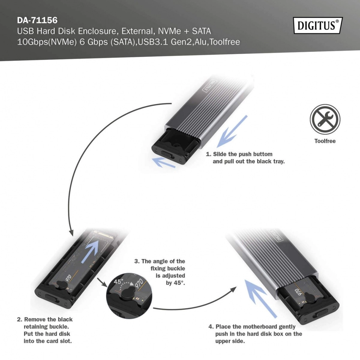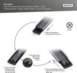 Rozšírte úložisko počas chvíľky s kompaktným a odolným hliníkovým puzdrom (Pantone 430C). Ponúka vysokorýchlostné prenosy až 10 Gb/s (NVMe) a 6 Gb/s (SATA), je plne plug and play a napája sa priamo z USB. Beznástrojová konštrukcia umožňuje rýchlu výmenu diskov.