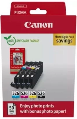 Využite výhody úspornej sady, ktorá obsahuje čierny, azúrový, purpurový a žltý atrament CLI-526 s objemom 9 ml a 50 listov fotografického papiera Photo Paper Plus Glossy II (4" × 6") pre tlačiareň PIXMA.