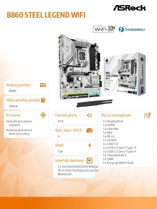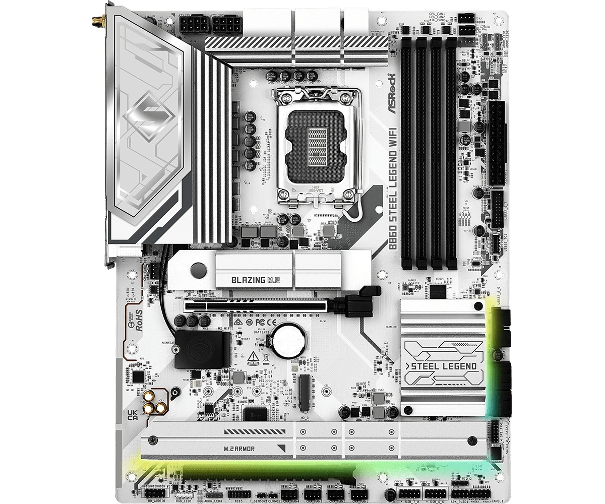 B860 Steel Legend WiFi je navrhnutá s ohľadom na pevnosť a estetickú príťažlivosť. Táto základná doska je určená ako pre bežných používateľov, tak aj pre nadšencov. Poskytuje stabilný a spoľahlivý výkon vďaka kvalitným materiálom a komponentom.