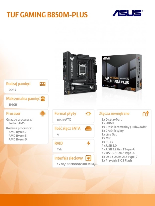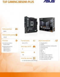 Základná doska ASUS TUF GAMING B850M-PLUS je navrhnutá pre dlhodobú stabilitu, spoľahlivosť a výkonný herný výkon. Využíva možnosti moderných procesorov AMD Ryzen, ponúka vylepšené napájanie, komplexné chladenie a širokú konektivitu pre náročných hráčov aj tvorcov. Testy odolnosti TUF a komponenty vojenskej triedy zaisťujú istotu aj pri dlhých herných maratónoch.
