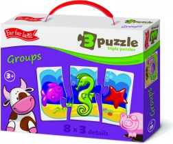 Súprava skladačiek Far Far Land trojice ponúka úžasný svet plný farebných obrázkov. Každá sada obsahuje 8 unikátnych obrázkov, ktoré sa skladajú z 3 dielikov. Tieto skladačky podporujú nielen kreativitu detí, ale aj ich schopnosť spájať a rozlišovať rôzne objekty.