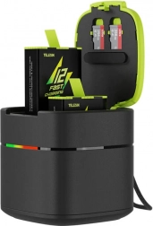 Nabíjačka Telesin podporuje ako originálne batérie GoPro, tak aj batérie tretích strán. Obsahuje dva sloty pre pamäťové karty.
