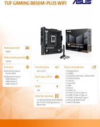 Základná doska ASUS TUF Gaming B850M-PLUS WiFi kombinuje odolnú konštrukciu z komponentov vojenskej triedy, vylepšené napájanie a komplexné chladenie pre stabilný výkon. Ponúka modernú konektivitu, podporu najnovších procesorov AMD Ryzen a nastavenie pripravené na náročné hranie aj AI aplikácie.