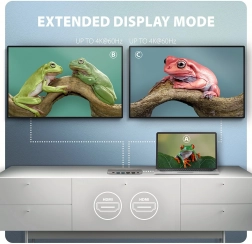Hub poskytuje dva porty USB‑A 5Gbps a jeden USB‑C 5Gbps pre dáta, zvládne trvalo obslúžiť aj viac externých diskov a umožní nabíjanie telefónov a tabletov až 1.5 A/5 V. Dvojica výstupov HDMI prenesie obraz až 4K/60 Hz (podporované tiež 2K/120–144 Hz a 1080p/240 Hz) vrátane HDR a viackanálového zvuku. Kovové telo zaisťuje odolnosť a efektívny odvod tepla.
