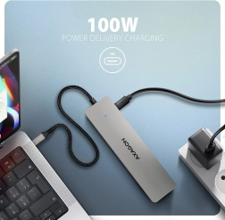 Rozšírte možnosti moderného notebooku jediným káblom USB‑C (15 cm). AXAGON HMC-7HX2 ponúkne súčasné pripojenie dvoch 4K/60 Hz monitorov, rýchlych periférií cez USB 3.2 Gen 1 (5Gbps), stabilnú sieť GLAN a zároveň notebook napája až 100 W PD 3.0. Ideálne na prácu aj zábavu doma aj na cestách.