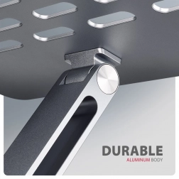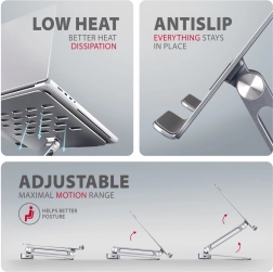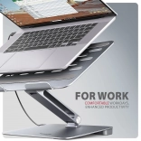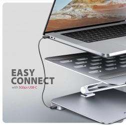 Elegantná a odolná konštrukcia z hliníkovej zliatiny poskytuje pasívne chladenie a stabilitu, zatiaľ čo protišmykové plochy chránia zariadenie pred poškriabaním. Stojan s dvojitým kĺbom umožňuje presné nastavenie výšky až 205 mm a uhla náklonu, aby bol displej v jednej rovine s externým monitorom. Hub rozšíri váš notebook o HDMI 4K/60 Hz, 3x USB-A 5Gbps, RJ‑45 Gigabit a USB‑C PD vstup 100 W.