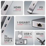 Výstup HDMI podporuje až 4K/60 Hz, 2K/120 Hz a 1080p/200 Hz vrátane HDR a viac-kanálového zvuku. USB-A 5Gbps obslúži externé disky (až dve súčasne), periférie aj nabíjanie až 7,5 W. Gigabit Ethernet zaistí stabilné sieťové pripojenie a cez USB‑C PD 3.0 nabijete notebook výkonom až 100 W. Pripojenie je jednoduché vďaka Plug & Play a Hot Plug.