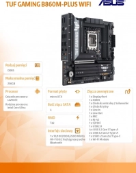 ASUS TUF GAMING B860M‑PLUS WIFI stavia na čipsete Intel B860 a ponúka robustné napájanie, kvalitné chladenie a dlhú životnosť. Vďaka podpore pamätí DDR5 až 8800 MHz a maximálnej kapacite 256 GB poskytuje plynulý beh náročných hier, multitaskingu aj kreatívnych aplikácií.