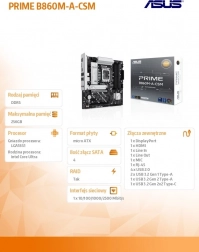 Základná doska ASUS Prime B860M-A CSM prináša spoľahlivý výkon pre procesory Intel Core Ultra a modernú výbavu pre rýchle a stabilné zostavy. Vďaka čipsetu Intel B860, podpore DDR5 až 256 GB a rozhraniam PCIe 5.0/4.0 ponúka skvelú priepustnosť, rozšíriteľnosť a dlhú životnosť v kompaktnom formáte microATX 24,4 × 24,4 cm.