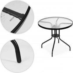 Okrúhla doska s priemerom 80 cm ponúka dostatok priestoru až pre štyri osoby. Špeciálna konštrukcia rámu zabezpečí stabilitu a odolnosť proti zaťaženiu aj použitiu slnečníka.