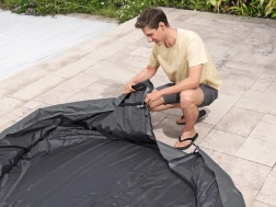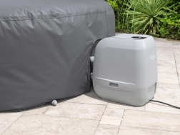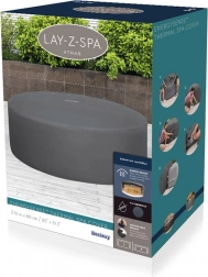 Montáž je rýchla a intuitívna. Nastaviteľný obvodový pás s bezpečnostnými klipsami zaistí pevné uchytenie, zatiaľ čo integrovaný zips umožní bezproblémové napojenie na čerpadlo bez nutnosti kryt dávať dole. Kryt je kompatibilný s modelmi Lay‑Z‑Spa St. Moritz, Monaco, Santorini HydroJet Pro a ďalšími okrúhlymi vírivkami s priemerom 216 cm.