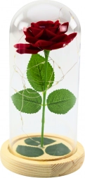 Táto večná červená ruža verne napodobňuje skutočný kvet a vďaka sklenej kupole si udrží svoj nadčasový vzhľad bez prachu a údržby. Teplé LED podsvietenie podčiarkuje krásu aranžmánu a premení váš domov na útulné a romantické miesto.