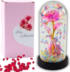 Ružová večná ruža v kupole, srdiečko, farebné guľôčky, LED svetielka, plastový podstavec, darčeková krabička