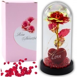Večná ruža v červenej farbe so srdiečkom a nápisom "LOVE", umiestnená v elegantnej kupole s jemným LED osvetlením, ponúka jedinečný a symbolický darček. Vďaka ozdobným červeným korálkam vytvára úžasný vizuálny efekt, ideálny pre romantické príležitosti.