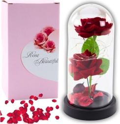 Tieto elegantné dekoračné ruže pod priehľadnou kupolou s jemným LED osvetlením sú dokonalým darčekom pre romantické príležitosti. Dve umelé ruže spoločne s lupienkami ruží vytvárajú neopakovateľnú atmosféru.