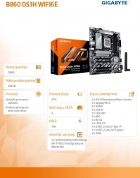 Gigabyte B860 DS3H WIFI 6E je moderná základná doska navrhnutá pre náročných používateľov aj staviteľov, ktorí chcú kombináciu výkonu, stability a jednoduchej inštalácie. Hybridná napájacia kaskáda 8+1+2 zaisťuje čisté napätie pre procesory Intel Core Ultra, zatiaľ čo pokročilé chladenie s M.2 heatsinkom udržiava vaše SSD v optimálnej kondícii.