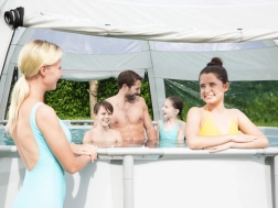 Vďaka veľkorysým rozmerom sa pavilón hodí aj pre väčšie nadzemné bazény – umožňuje komfortný pohyb, jednoduché používanie bazénového rebríka a zároveň poslúži ako záhradný altánok pre rodinné posedenie. Rýchla montáž približne za 30 minút a transportná taška uľahčia sezónne používanie.
