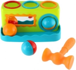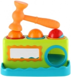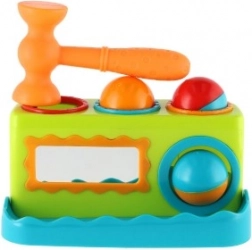 Táto farebná plastová zatlákačka s dĺžkou 21 cm je skvelou voľbou pre prvé rozvojové hry. Deti kladivkom bezpečne zatĺkajú tri balóniky do pripravených otvorov, čím trénujú úchop, silu a presnosť. Integrované zrkadielko na čelnej strane zvyšuje interakciu a zábavu.
