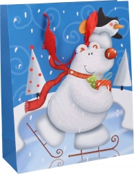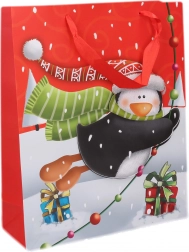 Štýlová vianočná darčeková taška v strednej veľkosti M (26 × 32 × 10 cm) na rýchle a elegantné zabalenie darčekov. Ponúka 4 rôzne vianočné motívy, je pevná, praktická a ideálna na knihy, kozmetiku či menšie boxy.