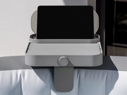 Jedna polička, štyri možnosti: stabilný stolík na nápoje a snacky, krytý úložný priestor na drobnosti, vešiak na uteráky a bezpečný držiak tabletu na sledovanie filmov vo vírivke.