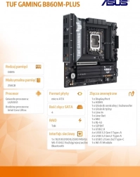 Základná doska Asus TUF Gaming B860M-PLUS je skutočným skvostom medzi základnými doskami, navrhnutá pre náročných hráčov a technologických nadšencov. Vďaka použitiu pätice LGA1851 a podpore procesorov Intel Core Ultra poskytuje neprekonateľný výkon a stabilitu počas intenzívneho používania.