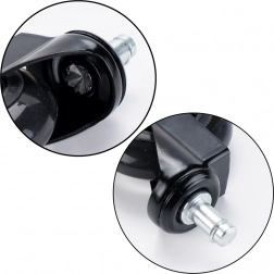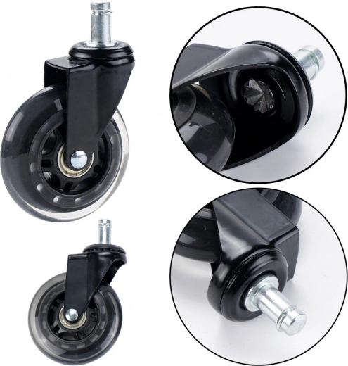 Gumené kolieska s mäkkým a pružným povrchom sú ideálne pre drevené podlahy, panely, lamináty, dlaždice a koberce, chrániace pred poškodením. Stabilná kovová konštrukcia každého kolieska zaručuje vysokú odolnosť s nosnosťou až 50 kg, čo poskytuje spoľahlivosť aj pri intenzívnom používaní v kancelárskych a herných stoličkách.