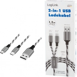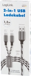 Univerzálny 2v1 kábel od LogiLink na nabíjanie a prenos dát ponúka konektory Micro USB a USB‑C v jednom. Vďaka opletenému textilnému prevedeniu je kábel odolný, flexibilný a vhodný pre širokú škálu zariadení. Podporuje nabíjanie až 5 V / 2 A (10 W), takže spoľahlivo napája telefóny, slúchadlá či drobnú elektroniku bez nutnosti mať viac káblov.