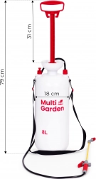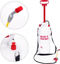 Praktický tlakový postrekovač s objemom 8 l od značky MULTIGARDEN pre pohodlnú starostlivosť o záhradu aj upratovanie okolo domu. Ponúka nastaviteľnú trysku (plochý a kužeľový rozptyl), dlhú sklolaminátovú lancu, piestové čerpadlo, bezpečnostný ventil a mierku na nádrži. Vďaka ergonomickému madlu a nastaviteľnému popruhu sa postrekovač pohodlne nosí a ovláda.