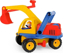 Farebný detský bager s dĺžkou 35 cm s otočnou hornou časťou, funkčným ramenom a figúrkou vodiča v kabíne. Disponuje 2 nápravami, blokáciou otáčania a praktickou rukoväťou za kabínou pre jednoduché ovládanie – ideálne na pieskovisko aj na domáce hranie.