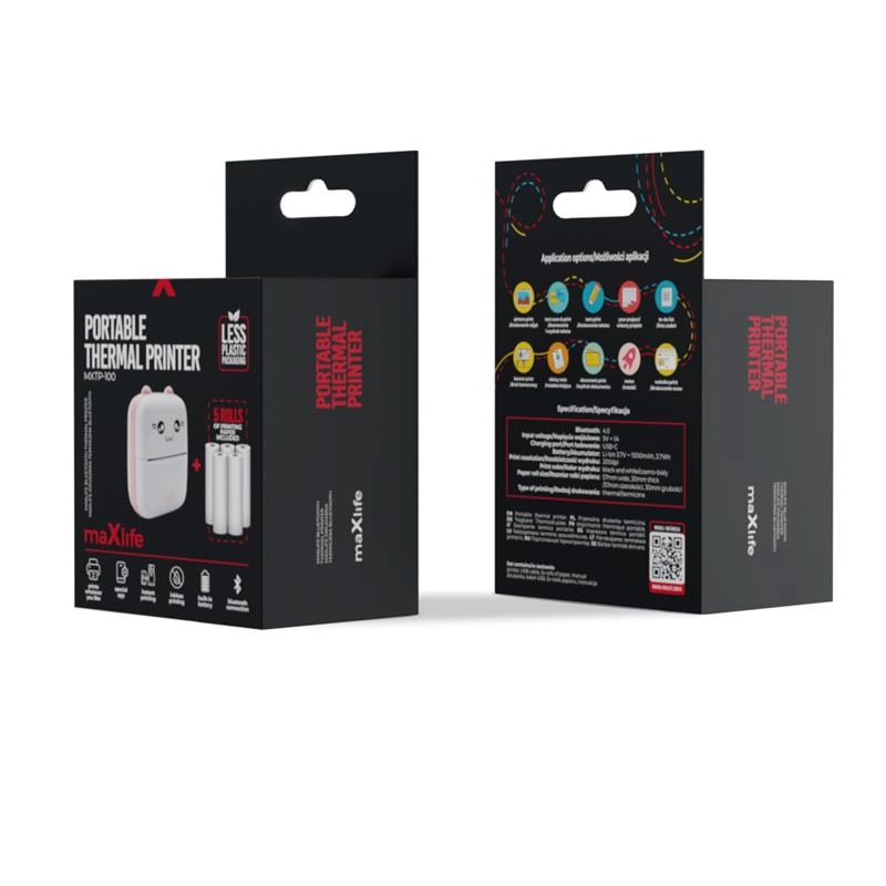 Kompaktná a roztomilo navrhnutá vrecková tlačiareň Maxlife s bezdrôtovým pripojením Bluetooth umožní rýchlu čiernobielu termálnu tlač fotiek, náčrtov, poznámok, etikiet aj nálepiek – bez atramentu. Vďaka aplikácii FunPrint ľahko tvoríte a upravujete obsah priamo v telefóne; v balení navyše získate 5 roliek termopapiera na okamžité použitie.