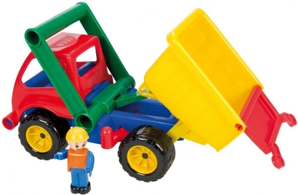 Korba má praktickú poistku proti samovoľnému vyklopeniu a kabínu možno ľahko odklopiť – vo vnútri čaká aktívny panáčik pripravený do práce. Hračka tak rozvíja jemnú motoriku, koordináciu aj role-play scenáre.