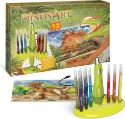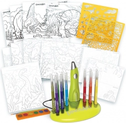 DinosArt airbrush maľovanky sada je ideálna pre každého malého umelca, ktorý miluje dinosaury a kreatívnu zábavu. Súčasťou sady je elektrické striekacie pero, nabíjacia stanica s USB káblom a celá rada špeciálnych fixiek a akvarelových farieb.