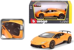 Doplňte svoju zbierku o licencovaný kovový model BBURAGO 1:24 LAMBORGHINI Huracán Performante v oranžovej farbe. Nadchne detailným spracovaním, otváracími dverami a gumovými pneumatikami. Ideálny pre zberateľov aj deti od 3 rokov, dodávaný v krabičke s priezorom.