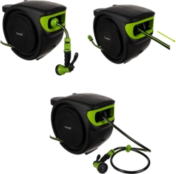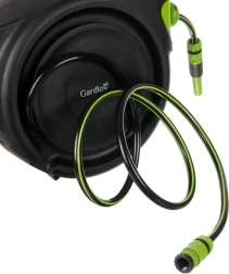 - Kompletná sada – obsahuje všetko potrebné: automatický navijak, 25 m hadicu, 7-funkčnú pištoľ, koncovky, prípojky, nástenný držiak s otáčaním o 180° a dokonca 2 m prívodnú hadicu.