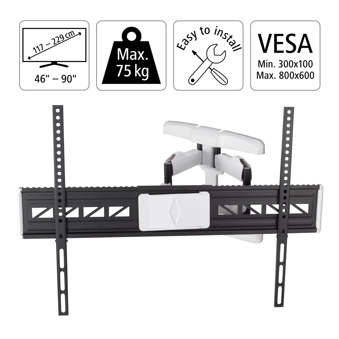 Podporuje televízory s uhlopriečkou od 46" do 90" a VESA štandardy od 300x100 až 800x600 mm.