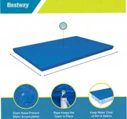 Kryt Bestway je navrhnutý tak, aby efektívne chránil váš bazén pred hmyzom, lístím, vtákmi a ľahkým dažďom. Vďaka pevným upevňovacím lanám je odolný voči vetru a jeho vypúšťacie otvory zabraňujú hromadeniu vody. Kryt poskytuje dodatočnú tepelnú izoláciu vody v bazéne.