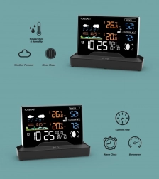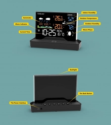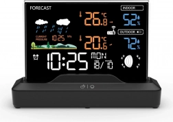Vďaka bezdrôtovému senzoru s dosahom až 30 m získate aktuálnu teplotu a vlhkosť z interiéru aj exteriéru. Barometer a vstavaná predpoveď počasia na 12–24 hodín vám uľahčia plánovanie dňa. Nechýba budík so snooze, kalendár ani zobrazenie fáz Mesiaca.