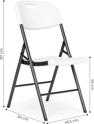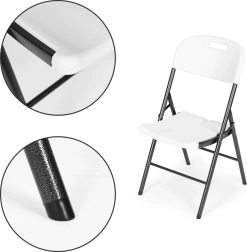 Kovová konštrukcia s práškovým povlakom a protišmykové nohy zaisťujú odolnosť a bezpečnosť. Skladací mechanizmus umožňuje rýchle zloženie a rozloženie stoličky.